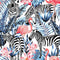 This bold and eye-catching pattern features a striking mix of black and white zebras, vivid pink flamingos, and vibrant tropical florals. The intricate design is complemented by lush blue and green foliage, creating a dynamic contrast that blends wildlife and tropical elements seamlessly. Set against a white background, this pattern adds an energetic and exotic vibe, making it a perfect choice for fashion-forward golf apparel that stands out on the course. The fusion of animals and florals provides a unique, adventurous aesthetic ideal for those looking to make a statement.