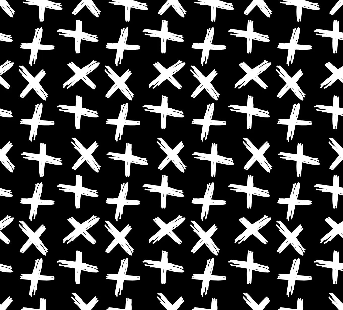 This modern and minimalist design features bold, white brushstroke X marks arranged in a grid pattern against a solid black background. The striking contrast between the white strokes and dark backdrop creates a sharp, graphic look, making this pattern ideal for those who want a sleek and edgy aesthetic. The imperfect, hand-drawn quality of the X shapes adds an artistic, dynamic touch, perfect for creating contemporary, fashion-forward apparel with a high visual impact.